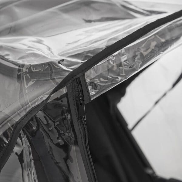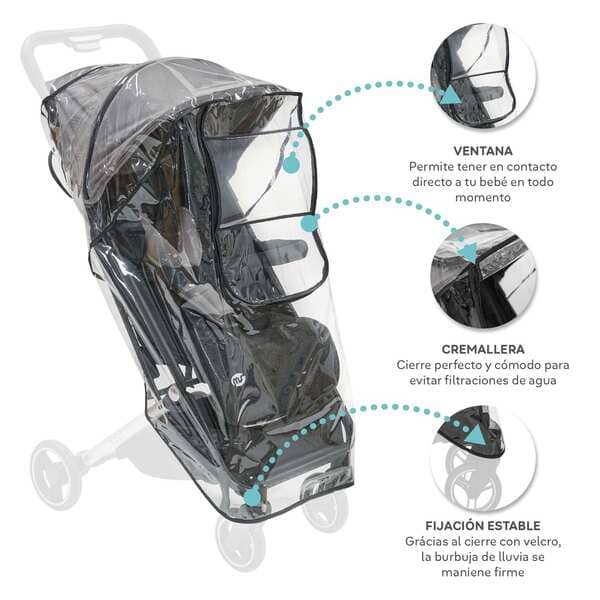 Este protector de lluvia es transparente para poder vigilar a tu peque y trae velcro para poder cerrarlo por la parte trasera y ventana en la parte frontal.
