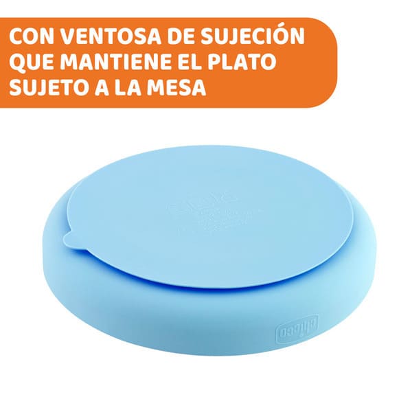 - VENTOSA DE SUJECIÓN: En la base de plato encontrarás una ventosa para fijar el plato en la mesa o en la trona, para evitar que se vuelque y se derrame la comida del bebé.