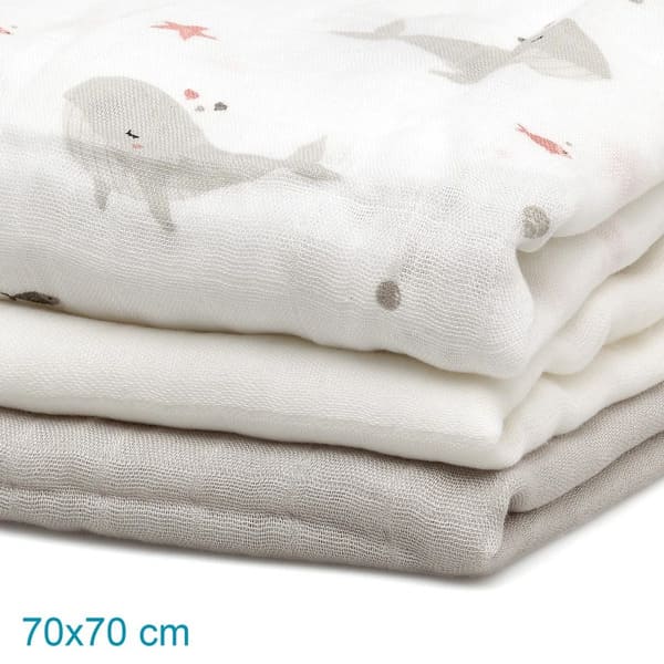 En cada set encontraremos tres muselinas de gran tamaño (70cm x 70cm) y gramaje (140gr) lo cual las dota de más empaque, caída y cobertura, pero ligereza al mismo tiempo.