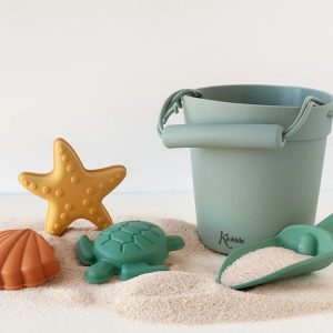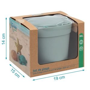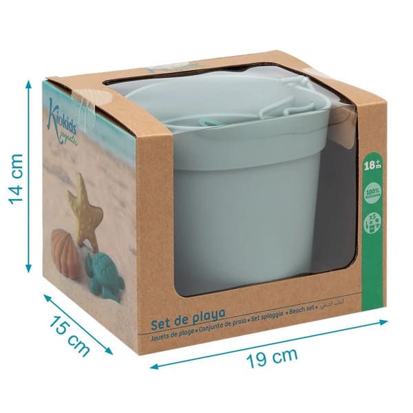 El set está compuesto por un cubo, una pala y 3 figuras para moldear con ellas en la arena.