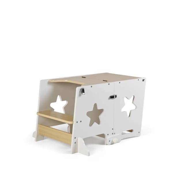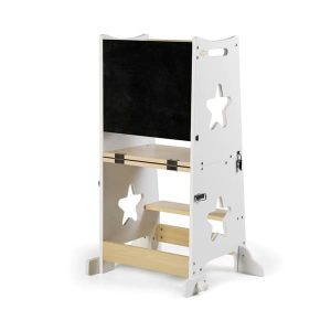 Además de torre de aprendizaje, se transforma en una práctica mesa con silla infantil. Incluye una pizarra para estimular la creatividad. Su diseño plegable facilita guardarla sin ocupar espacio extra.