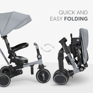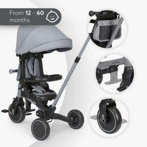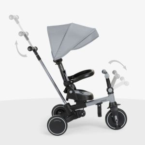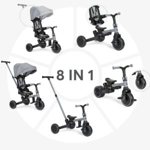 - Diseño 8 en 1 : se transforma fácilmente en cada etapa: modos de cuidado para los ciclistas más pequeños, modos de empuje y paseo para niños pequeños y, finalmente, en un modo de triciclo y bicicleta para niños mayores de hasta 60 meses.