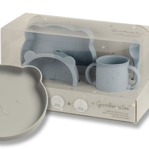 Juego de vajilla, fabricado en silicona alimentaria; material resistente, flexible, anti-bacterias y eco-friendly.