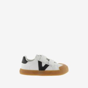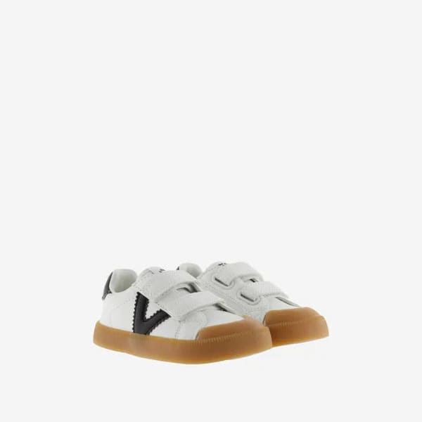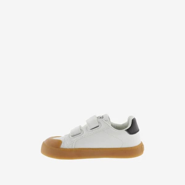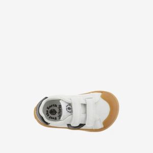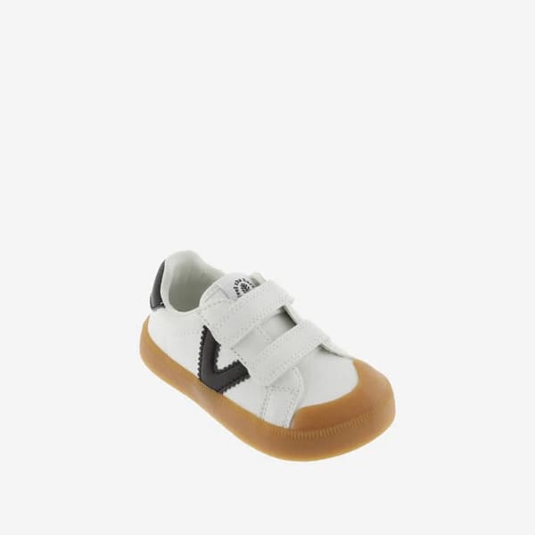 Zapatillas deportivas barefoot para niños fabricadas en material efecto piel. V del lateral y pieza trasera en color negro en contraste. Cierre mediante dos tiras adherentes, tres a partir de la talla 36, que facilitan el calce y aportan sujección. Suela de goma en color caramelo.
